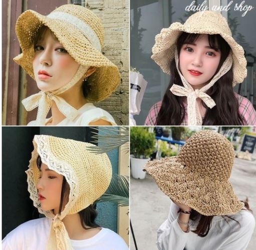 프렌치시크백 지니얼 여성용 여름 여행 리본 버킷 왕골 밀집모자