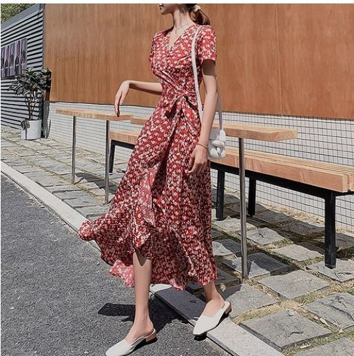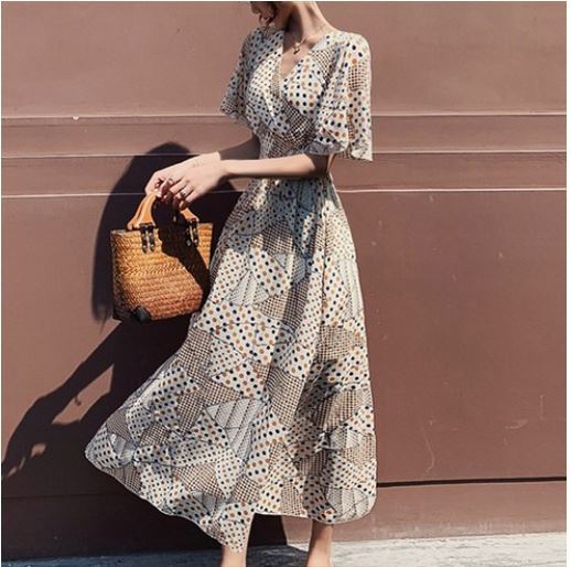헤링본 여름 롱 비치원피스 쉬폰 반팔 랩 데일리