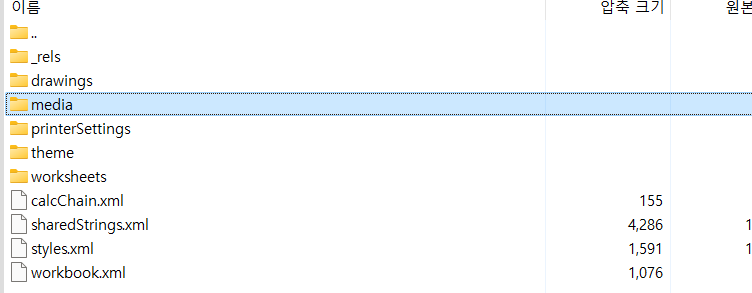 2. 압축파일을 클릭하여 풉니다.(xl폴더 클릭->media폴더 클릭)
