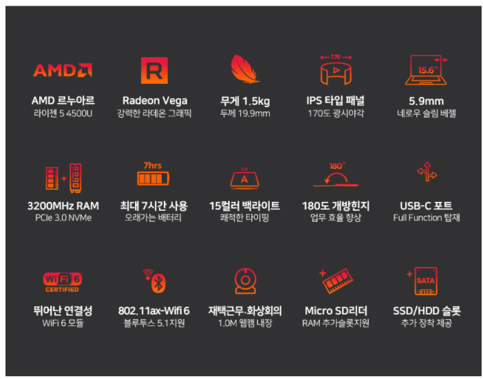 화면크기 : 15인치(37~39cm) 무게 : 1.5kg종류 : 라이젠 5운영체제 : 미포함(FreeDos)CPU : 라이젠5-4500U칩셋 제조사 : AMD코어종류 : 헥사코어코드명 : 르누아르CPU속도 : 2.3GHz터보부스트 : 4.0GHz램 : 8GB메모리 타입 : DDR4AMD GPU : 라데온 Graphics그래픽 메모리 : 시스템 메모리 공유해상도 : 1920x1080(FHD)