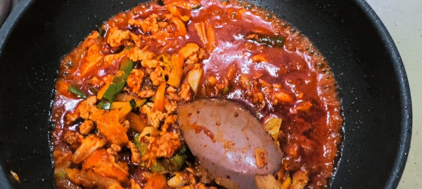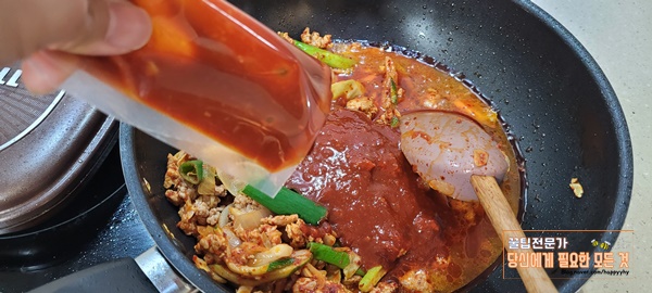 고춧가루를 넣고 볶다 물과 소스를